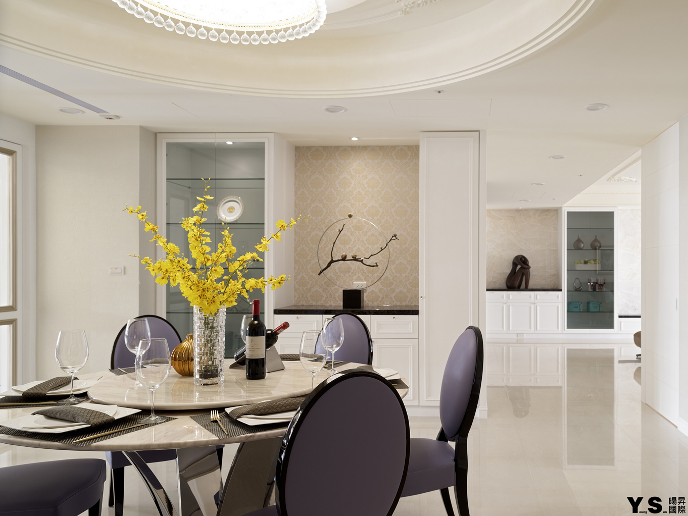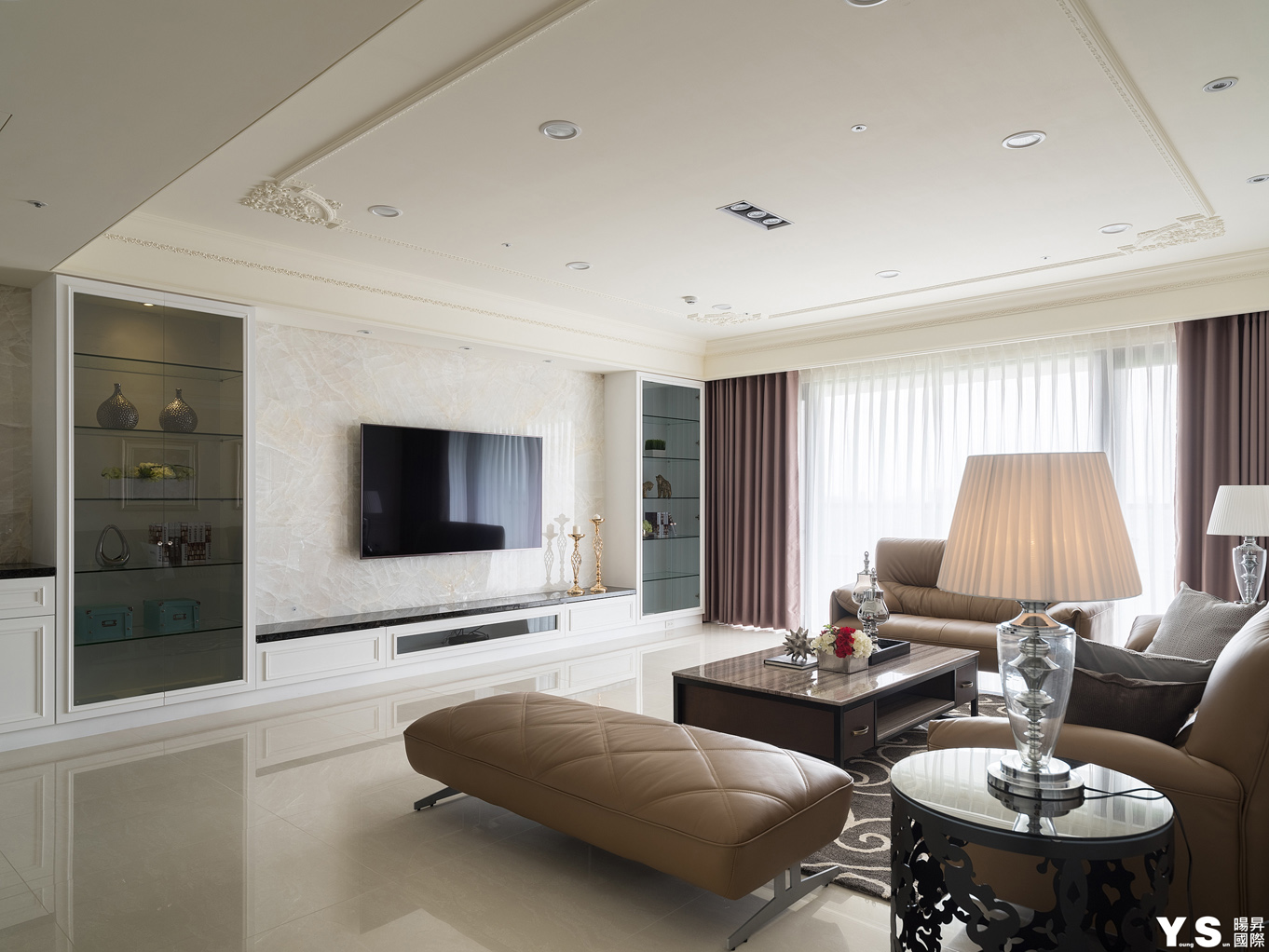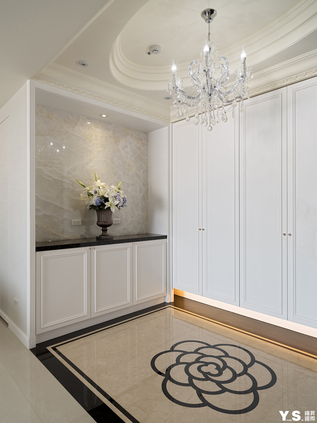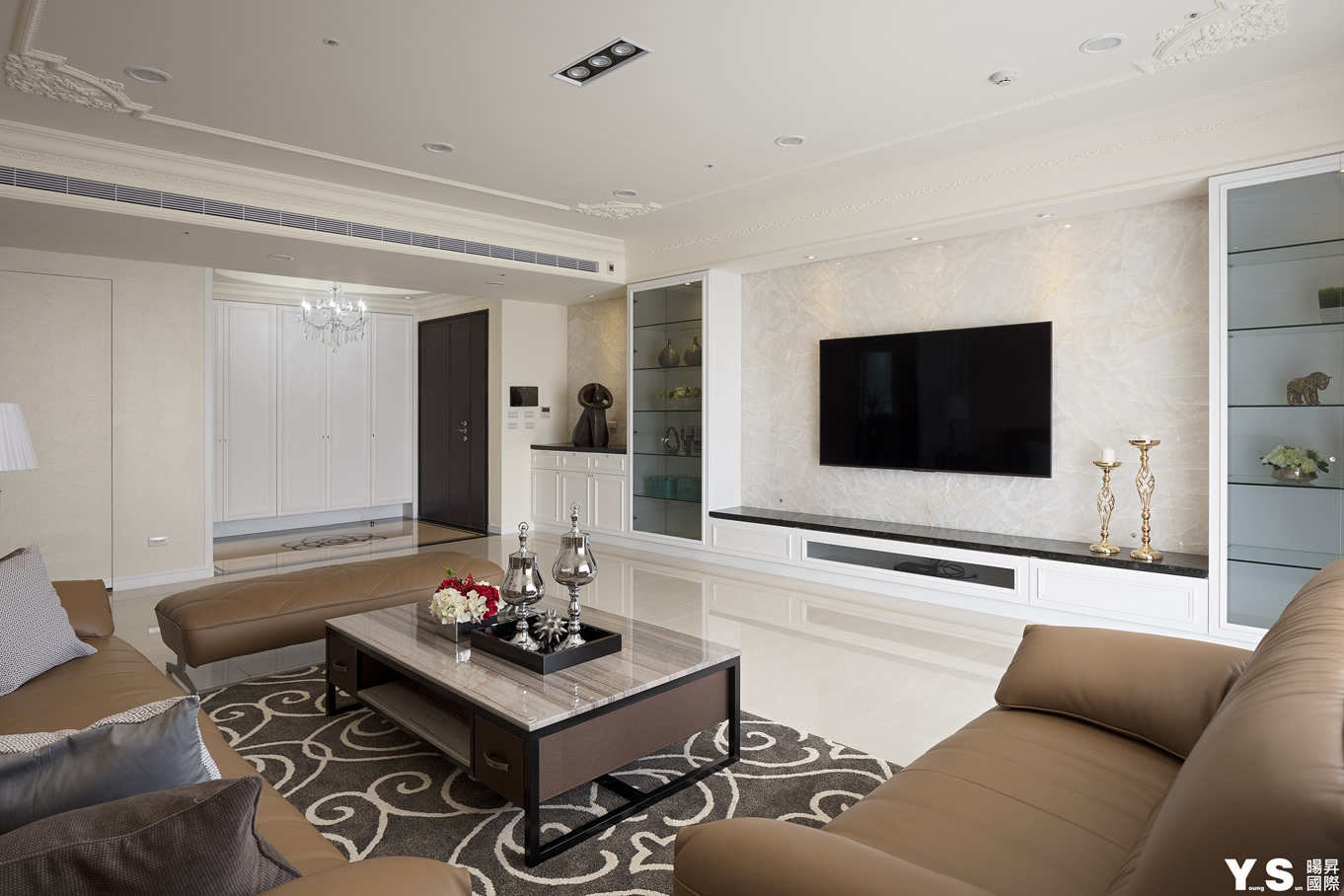 YS暘昇國際室內裝修工程在不過度切割格局的前提下獨立出各機能區塊。從玄關進入後,一旁有白色線板衣帽鞋履收納櫃,水切大理石山茶花地坪與立面的珍珠玉大理石紋奠定不凡氣場,在橢圓內凹天花板垂墜一盞白色水晶吊燈,烘托出典雅華麗貴氣。客廳天花板框出簡約線板,四個角落特別加強裝飾性。珍珠玉大理石電視牆兩端設置對稱的灰玻璃展示櫃,彰顯博物館般的蒐藏家品味。