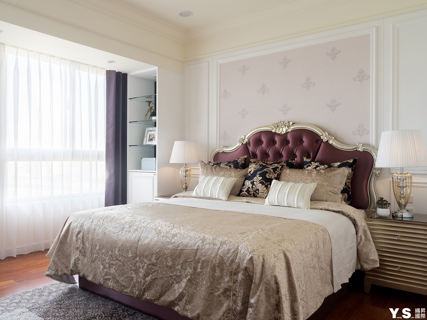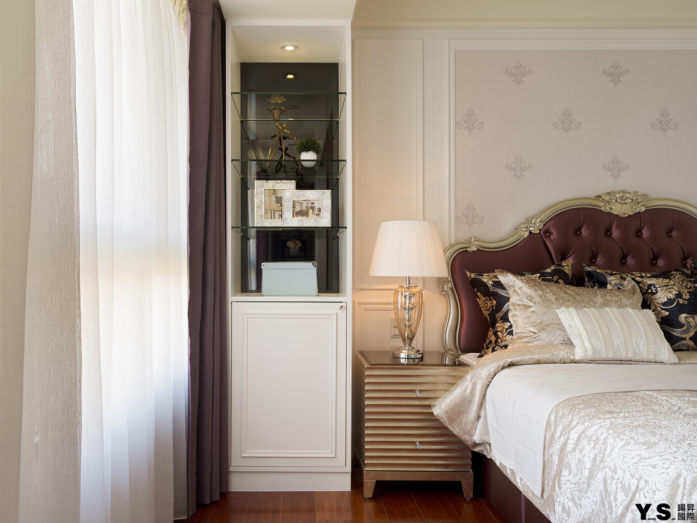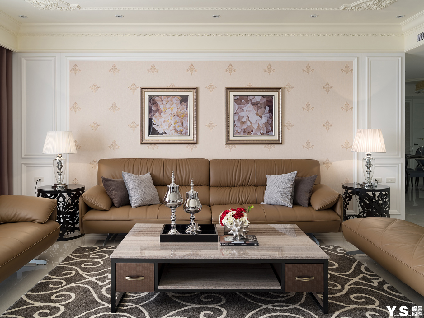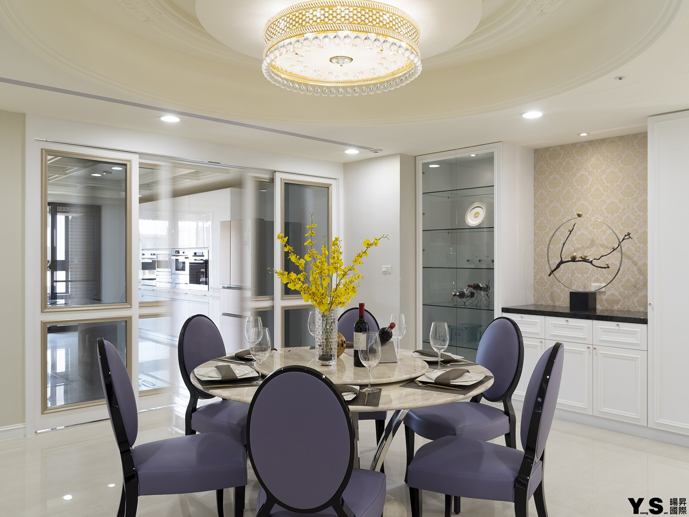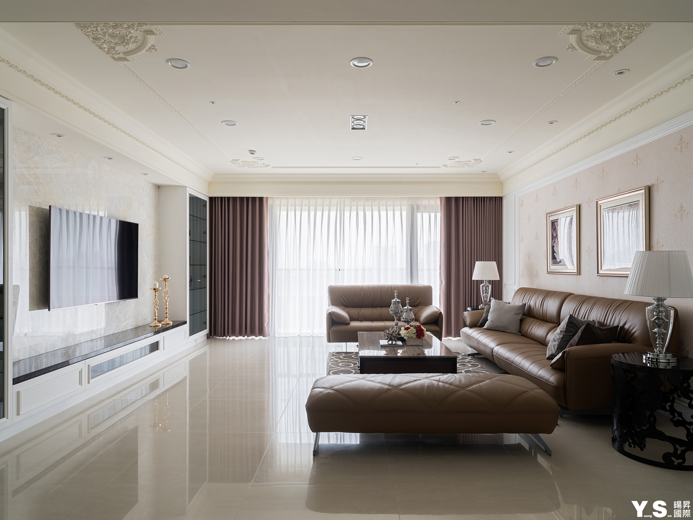YS暘昇國際室內裝修工程在不過度切割格局的前提下獨立出各機能區塊。從玄關進入後,一旁有白色線板衣帽鞋履收納櫃,水切大理石山茶花地坪與立面的珍珠玉大理石紋奠定不凡氣場,在橢圓內凹天花板垂墜一盞白色水晶吊燈,烘托出典雅華麗貴氣。客廳天花板框出簡約線板,四個角落特別加強裝飾性。珍珠玉大理石電視牆兩端設置對稱的灰玻璃展示櫃,彰顯博物館般的蒐藏家品味。