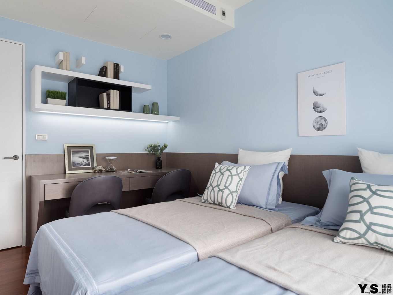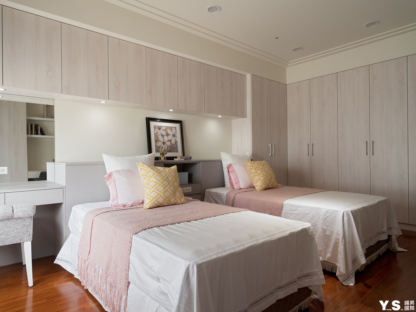 餐廳與廚房之間設置玻璃自動門,門框的金色調勾勒古典神采。李宗育設計師在私領域分別成立男孩房與女孩房,不僅活動空間更寬闊,亦有助手足從小締結深厚情誼,書房兼客房可在孩子成長後調整成獨立臥室。空間整體以大地色為基調,搭配家飾跳色活絡氛圍,不走歐式奢華,另闢出氛圍清爽簡淨的新古典途徑。