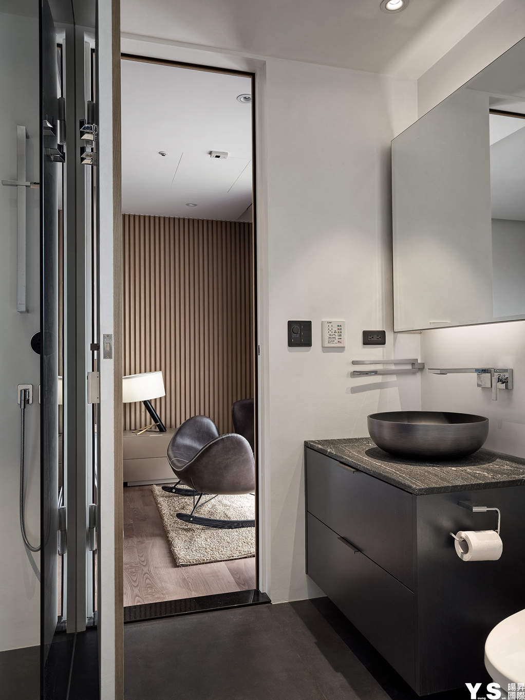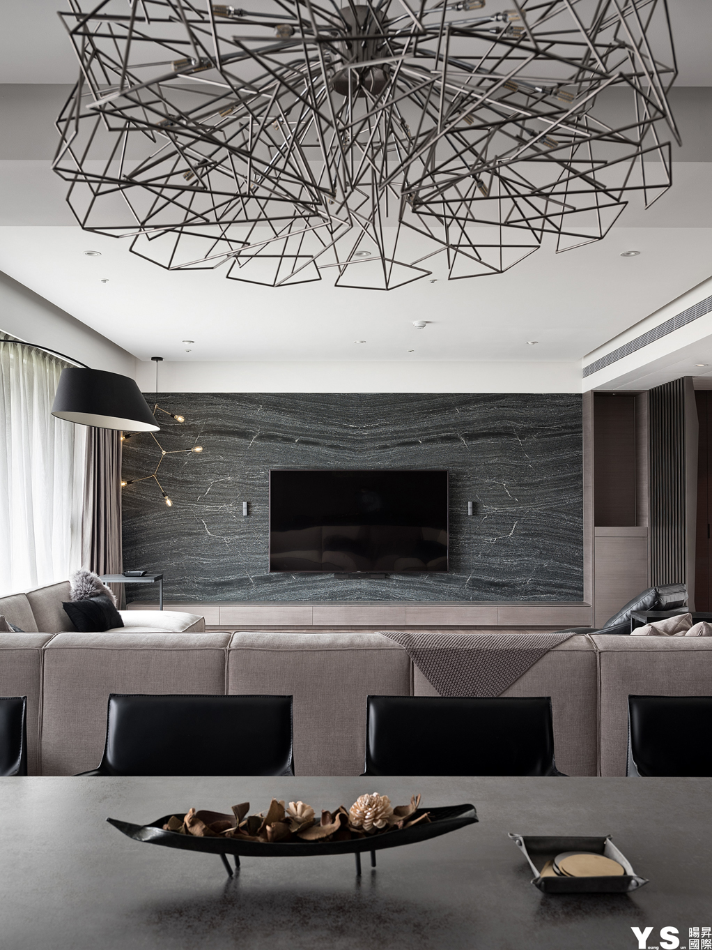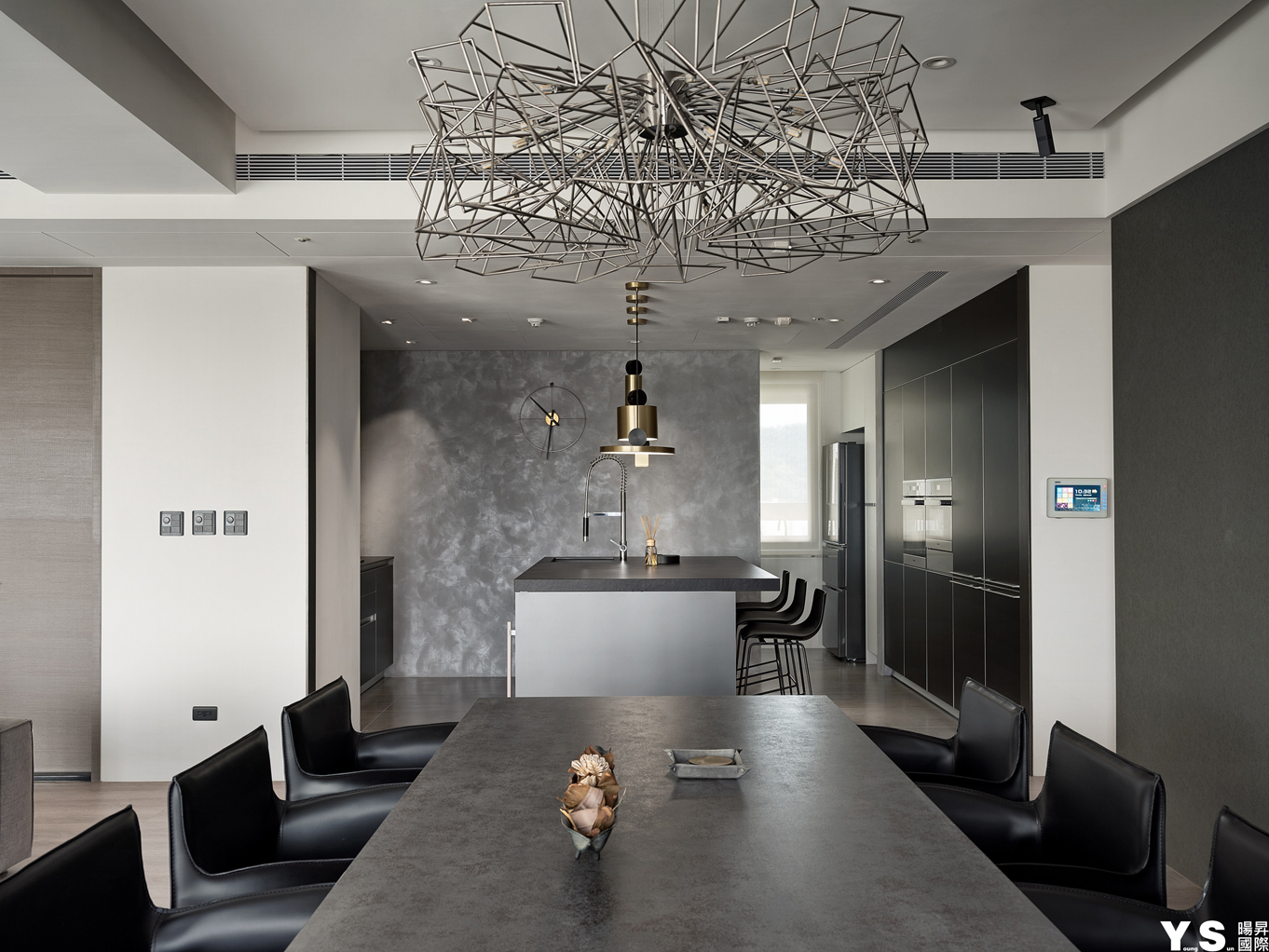 入口處設置格柵,定義出玄關,同時化解風水疑慮。格柵旁量身訂製佛龕,使其符合機能卻不顯突兀,完美融入空間。客廳電視牆選用紋理柔美的大理石,搭配樹枝狀燈具,形成和諧構圖。餐廳主牆鋪陳灰質壁紙,與電視牆相互呼應,表現均衡美感。餐桌的石材薄板與輕食區的特殊漆牆面,雖然材質迥異,但隱透光澤的紋理卻流暢串起空間關係,擴大生活圈,聚攏一家人情誼。李宗育設計師在化繁為簡的設計中,藏匿精緻細節,創造開闊敞亮的舒放感,深度詮釋居者的美學思維,找回簡單純粹的美好。