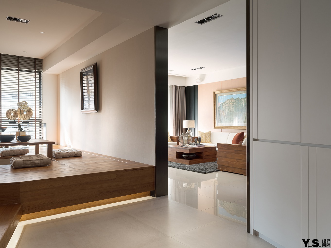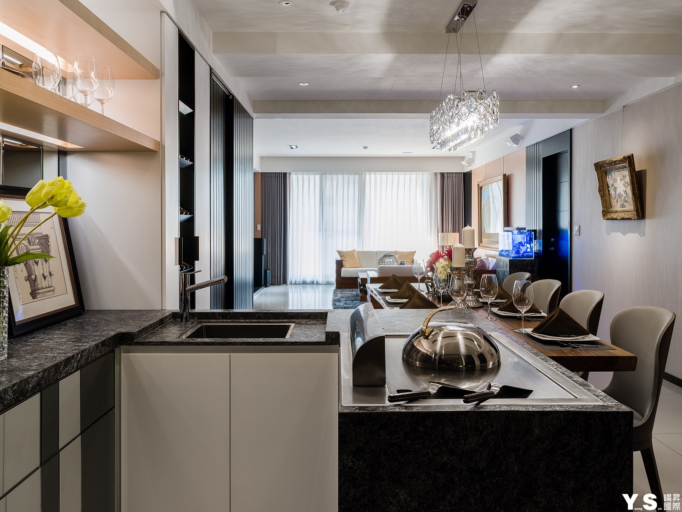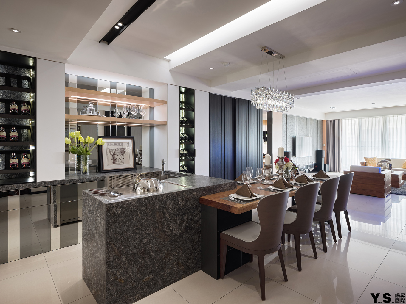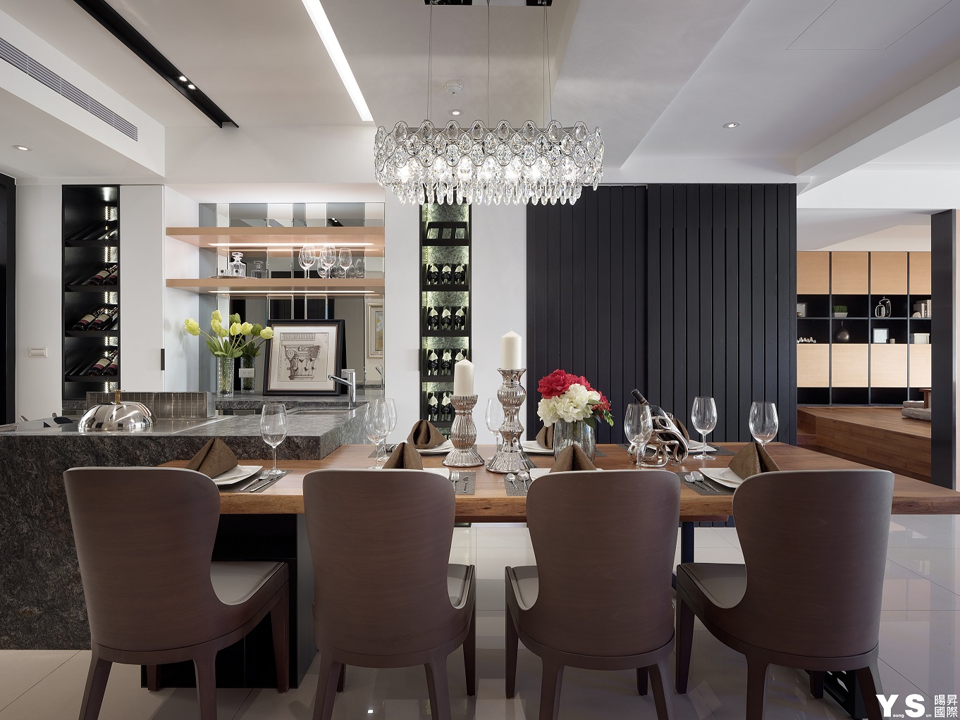 本案是屋主第三次委託YS暘昇國際設計,不同於先前的古典奢華風,此次更著重於打造業主的紓壓天地。李宗育設計師選用木質營造溫馨舒適的生活暖度,再選用鍍鈦、大理石、薄岩板雕琢空間的設計感與精緻度,並在牆面與天花以「層次感」為空間帶來與眾不同的輕快節奏;由於往來親友眾多,公領域的設計重心改放在餐廚區及和室,藉由玄關旁和室的架高地板及展示收納櫃體達到收納、聚會兼顧的實用效果,餐廚區的收納櫃更大方展現屋主的紅酒收藏,並善用主燈與鏡材營造華美意象,餐桌除了富有異材質拼接的巧思外,中島餐桌結合的設計更適合屋主與訪客互動,歡樂時刻絕不冷場。